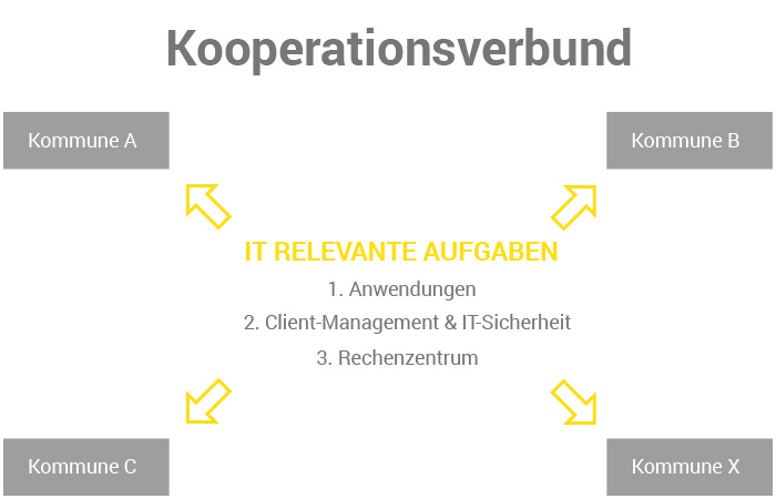 Unter dem Stichwort „interkommunaler Kooperationsverbund“ wird dabei nicht nur über das Verlagern von IT-Aufgaben nachgedacht, sondern im Verbund übernimmt derjenige bestimmte Aufgaben, der bereits Kernkompetenzen entwickelt hat.
